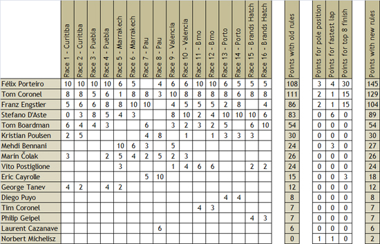 After the Pau race, Engstler would have been two points behind Porteiro. The race after that, in Valencia, it would have been Coronel who had been two points behind on Porteiro. After the last race, Coronel would even have led the championship with three points over Tom Coronel.