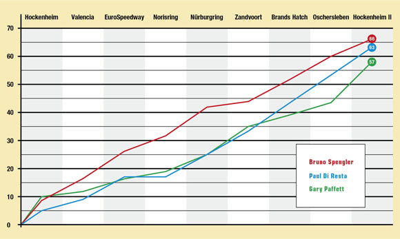 Three points separate the two men but there is a chance that a former champion can reclaim the title if the aforementioned pair bottle it. Gary Paffett, champion of 2005, is nine points adrift of the lead and so needs to win to stand any chance of claiming a second crown.