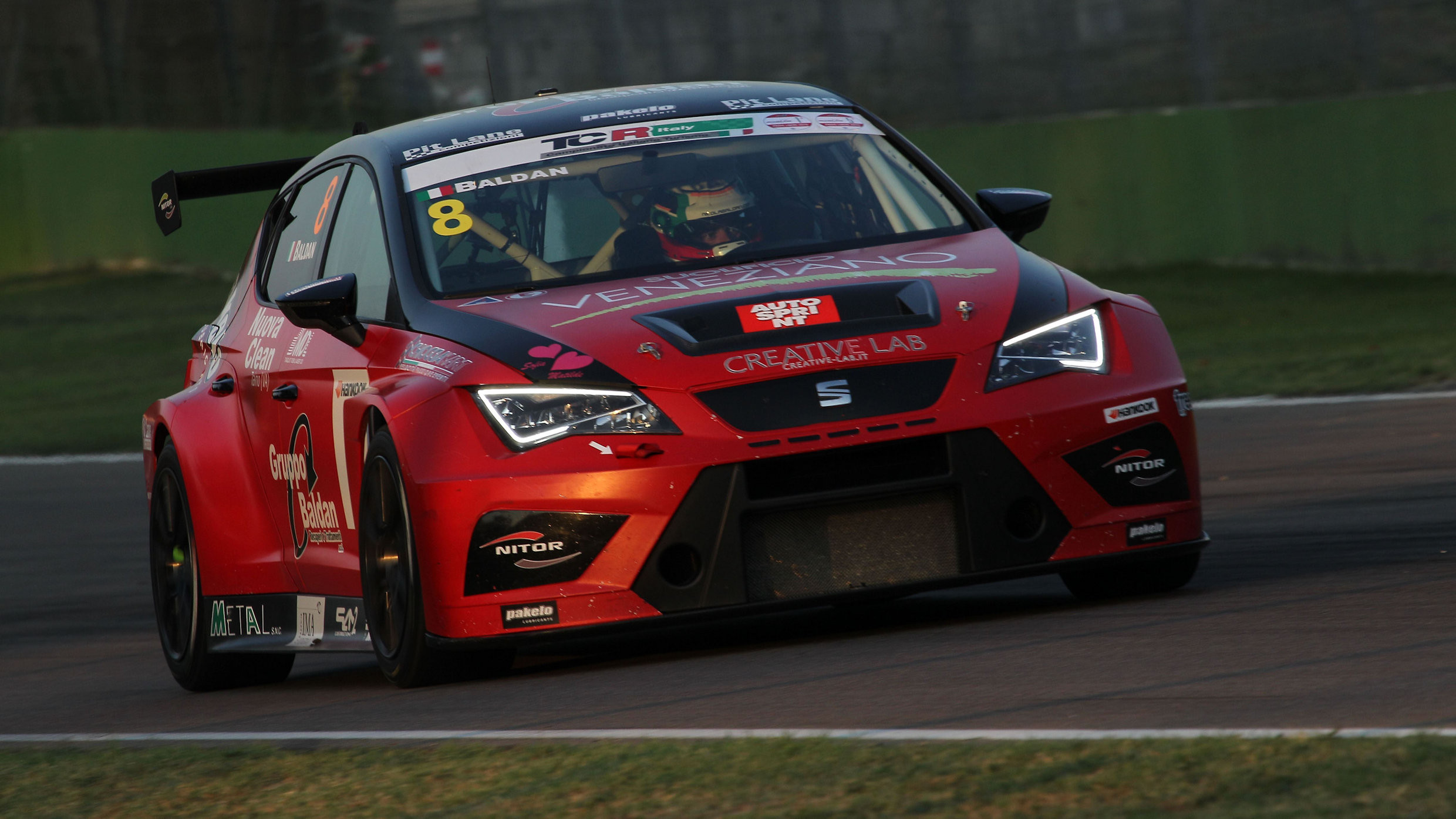 Pit Lane Competizioni’s Nicola Baldan won the second race of the TCR Italy series weekend at Imola, leading the way in his SEAT León ahead of title rival Eric Scalvini, in a race which featured just three laps of green flag racing due to heavy rain.