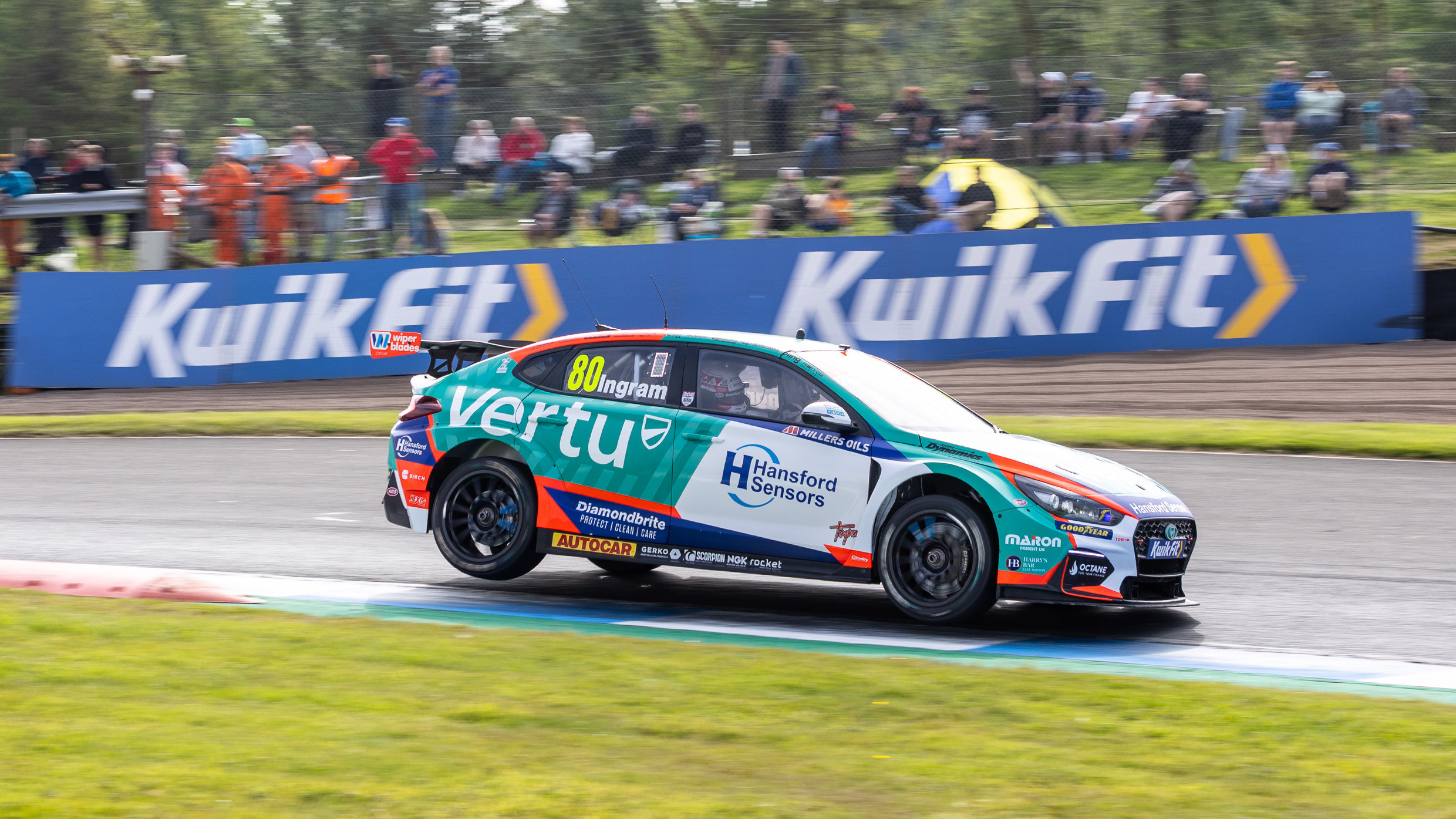 West Surrey Racing’s Jake Hill and Charles Rainford maintained first and second as the lights went out however it wasn’t long before Ingram was on the move, with the Hyundai i30 driver dispatching Rainford first at the end of lap one exiting the hairpin.