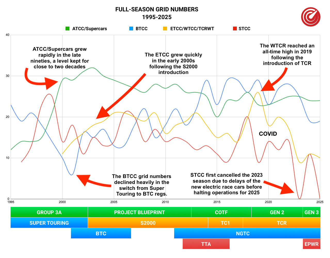 Let’s take a look at the development of full-season entries over the past three decades, focusing on four key championships: BTCC, WTCC/TCR World Tour, Supercars and STCC.